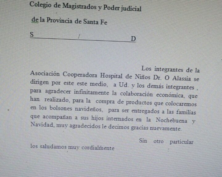 El Colegio de Magistrados y Funcionarios del Poder Judicial de la provincia de Santa Fe -Zona Norte- se dirige a uds. con el fin de poner en su conocimiento que lo recaudado a través de las donaciones realizadas por nuestros asociados y asociadas, fue de $ 127.000; dicho monto fue transferido a la Asociación Cooperadora del Hospital de Niños, Dr. Orlando Alassia.